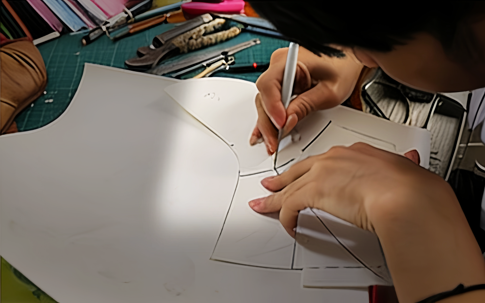 職人がバッグのデザインに基づき、手作業で版型を描き、紙型を裁断します。バッグの最終的な版型・構造・寸法精度を決定する重要な工程です。