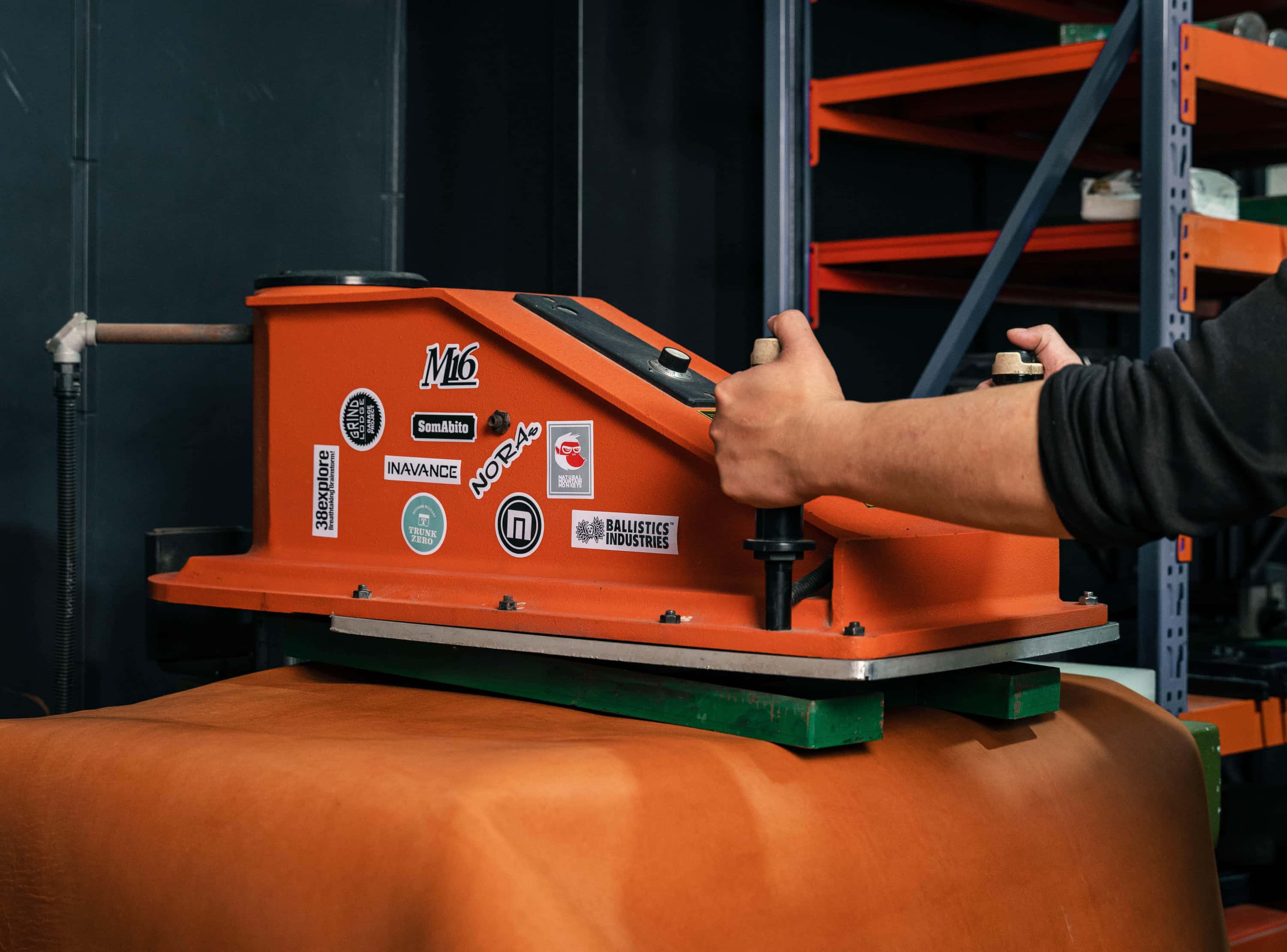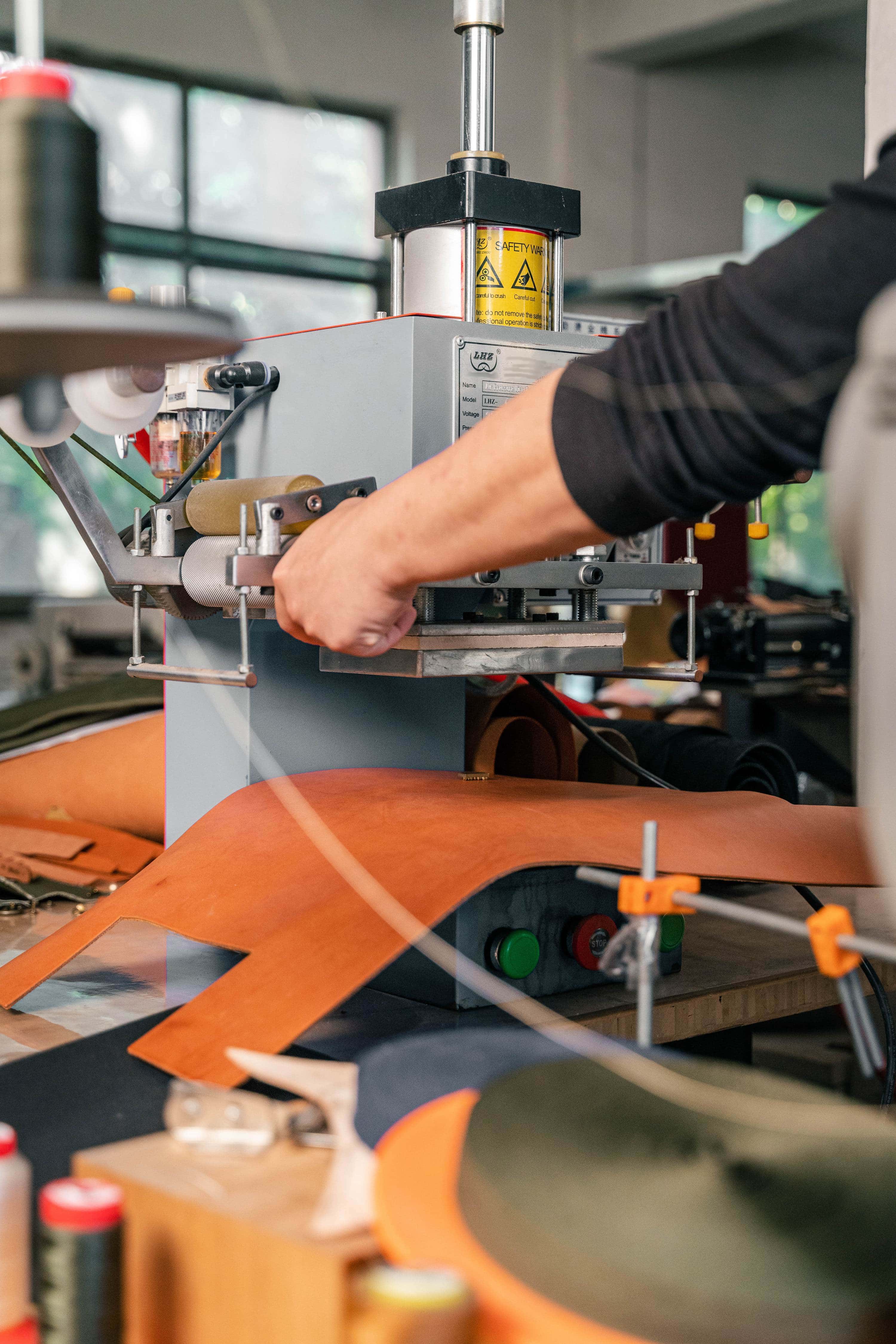 専用の油圧裁断機を使用し、原革からバッグ本体や持ち手などのパーツを正確に切り出し、製品の基礎を作ります。