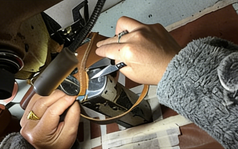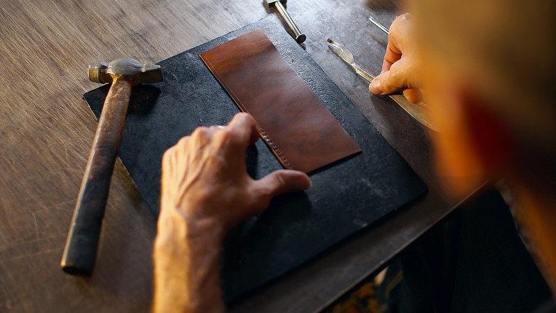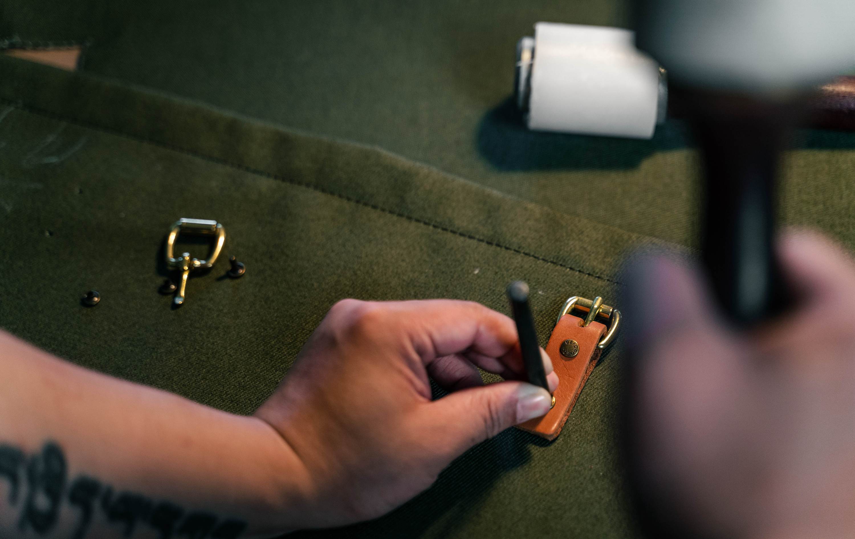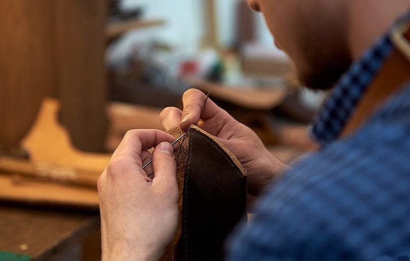職人が手作業で細部を裁断し、革のコバ(端)を修整し、縫製や金具取り付けのための穴を精密に開けます。