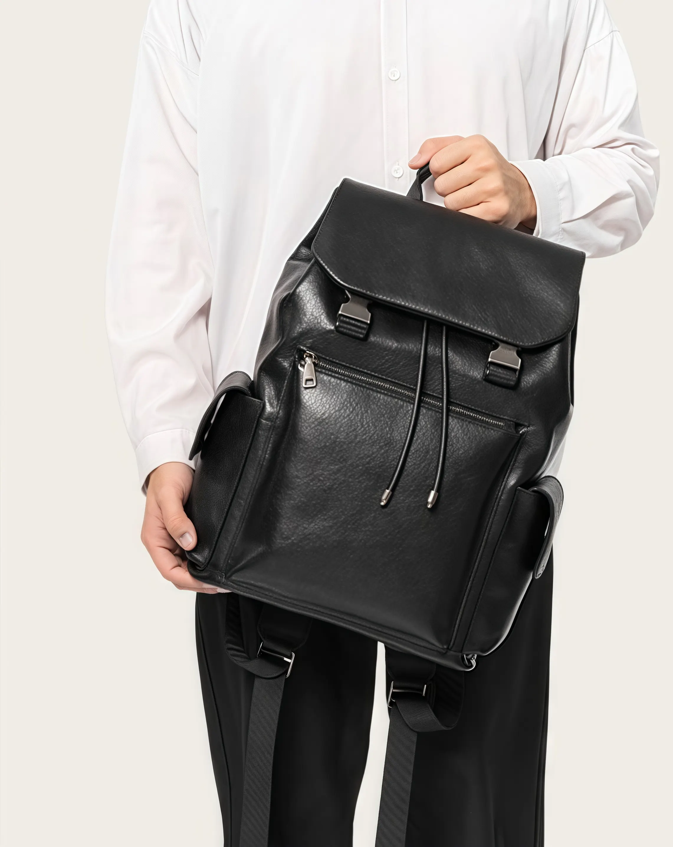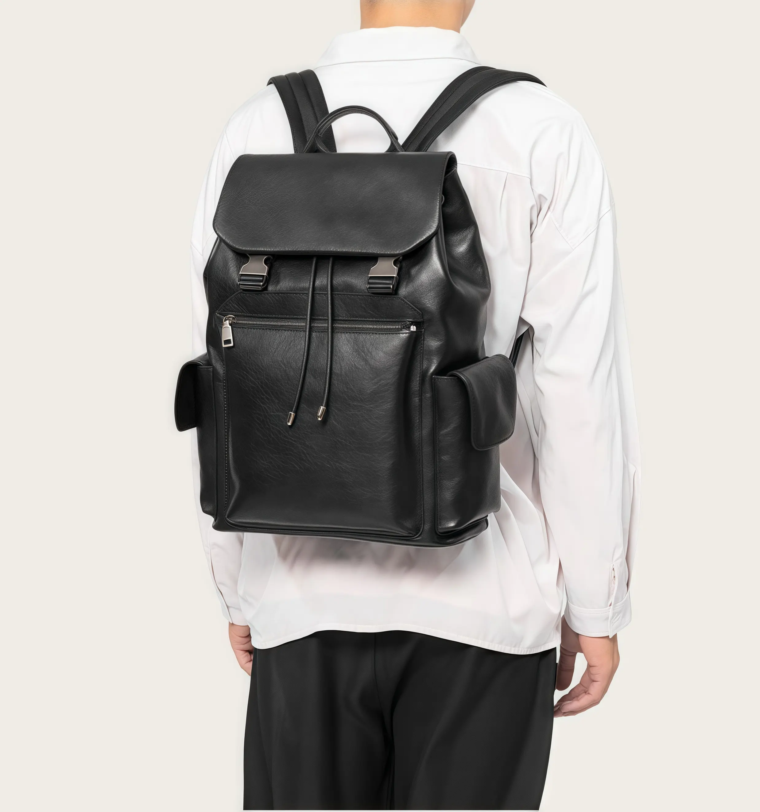 このリュックパックは、厚みと柔らかさを兼ね備えた植鞣牛革で仕上げられています。テクスチャーは鮮明で、革表面には植鞣処理特有の艶やかな光沢があります。控えめで質実な設計コンセプトのもと、長年の技術を積んだベテラン革職人が巧みに仕上げた逸品です。